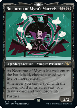 As Nocturno of Myra's Marvels enters the battlefield, chose a word with five or more letters.
