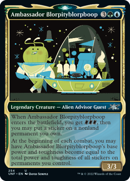 Quand Ambassador Blorpityblorpboop arrive sur le champ de bataille, vous gagnez ticketticketticket, puis vous pouvez mettre un autocollant sur un permanent non-terrain que vous possédez.