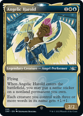 When Angelic Harold enters the battlefield, you may put a name sticker on a nonland permanent you own.
