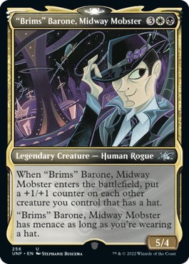 Quand "Brims" Barone, Midway Mobster arrive sur le champ de bataille, mettez un marqueur +1/+1 sur chaque autre créature que vous contrôlez qui a un chapeau.
