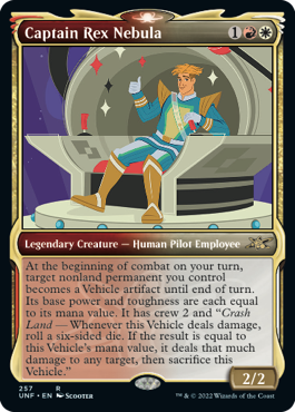 At the beginning of combat on your turn, target nonland permanent you control becomes a Vehicle artifact until end of turn. Its base power and toughness are each equal to its mana value. It has crew 2 and "Crash Land — Whenever this Vehicle deals damage, roll a six-sided die. If the result is equal to this Vehicle's mana value, it deals that much damage to any target, then sacrifice this Vehicle.".