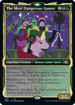 Whenever The Most Dangerous Gamer enters the battlefield or attacks, open an Attraction.