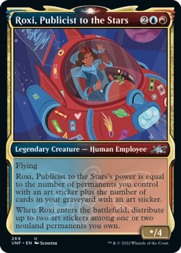 La force de Roxi, Publicist to the Stars est égale au nombre de permanents que vous contrôlez avec un autocollant d'illustration plus le nombre de cartes dans votre cimetière avec un autocollant d'illustration.