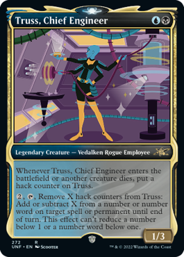 À chaque fois que Truss, Chief Engineer arrive sur le champ de bataille ou qu'une autre créature meurt, mettez marqueur "hack" sur Truss.