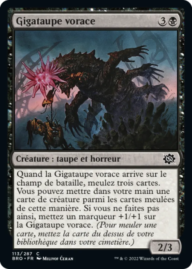 Quand la Gigataupe vorace arrive sur le champ de bataille, meulez trois cartes. Vous pouvez mettre dans votre main une carte de créature parmi les cartes meulées de cette manière. Si vous ne faites pas ainsi, mettez un marqueur +1/+1 sur la Gigataupe vorace.