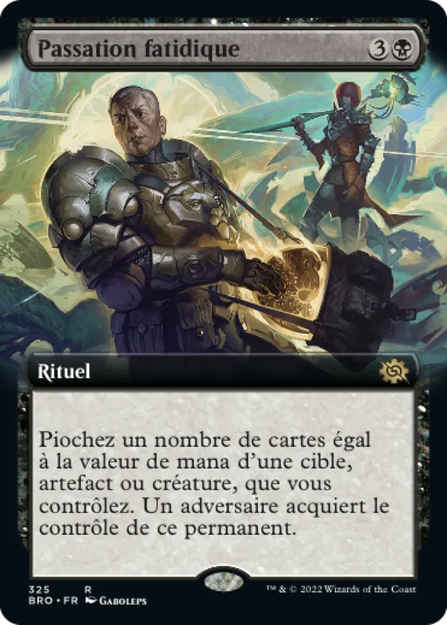 Piochez un nombre de cartes égal à la valeur de mana d'une cible, artefact ou créature, que vous contrôlez. Un adversaire acquiert le contrôle de ce permanent.