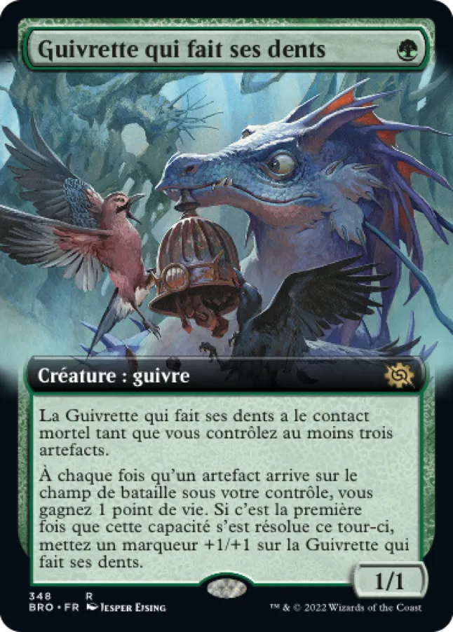 À chaque fois qu'un artefact arrive sur le champ de bataille sous votre contrôle, vous gagnez 1 point de vie. Si c'est la première fois que cette capacité s'est résolue ce tour-ci, mettez un marqueur +1/+1 sur la Guivrette qui fait ses dents.