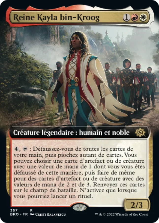 : Défaussez-vous de toutes les cartes de votre main, puis piochez autant de cartes. Vous pouvez choisir une carte d'artefact ou de créature avec une valeur de mana de 1 dont vous vous êtes défaussé de cette manière, puis faire de même pour des cartes d'artefact ou de créature avec des valeurs de mana de 2 et de