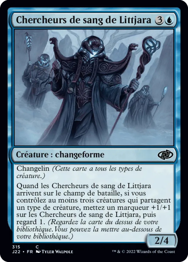 Quand les Chercheurs de sang de Littjara arrivent sur le champ de bataille, si vous contrôlez au moins trois créatures qui partagent un type de créature, mettez un marqueur +1/+1 sur les Chercheurs de sang de Littjara, puis regard