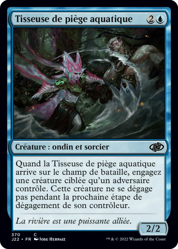 Quand la Tisseuse de piège aquatique arrive sur le champ de bataille, engagez une créature ciblée qu'un adversaire contrôle. Cette créature ne se dégage pas pendant la prochaine étape de dégagement de son contrôleur.
