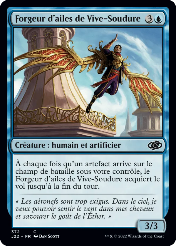 À chaque fois qu'un artefact arrive sur le champ de bataille sous votre contrôle, le Forgeur d'ailes de Vive-Soudure acquiert le vol jusqu'à la fin du tour.