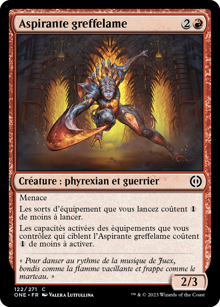 Les capacités activées des équipements que vous contrôlez qui ciblent l'Aspirante greffelame coûtent 1 de moins à activer.