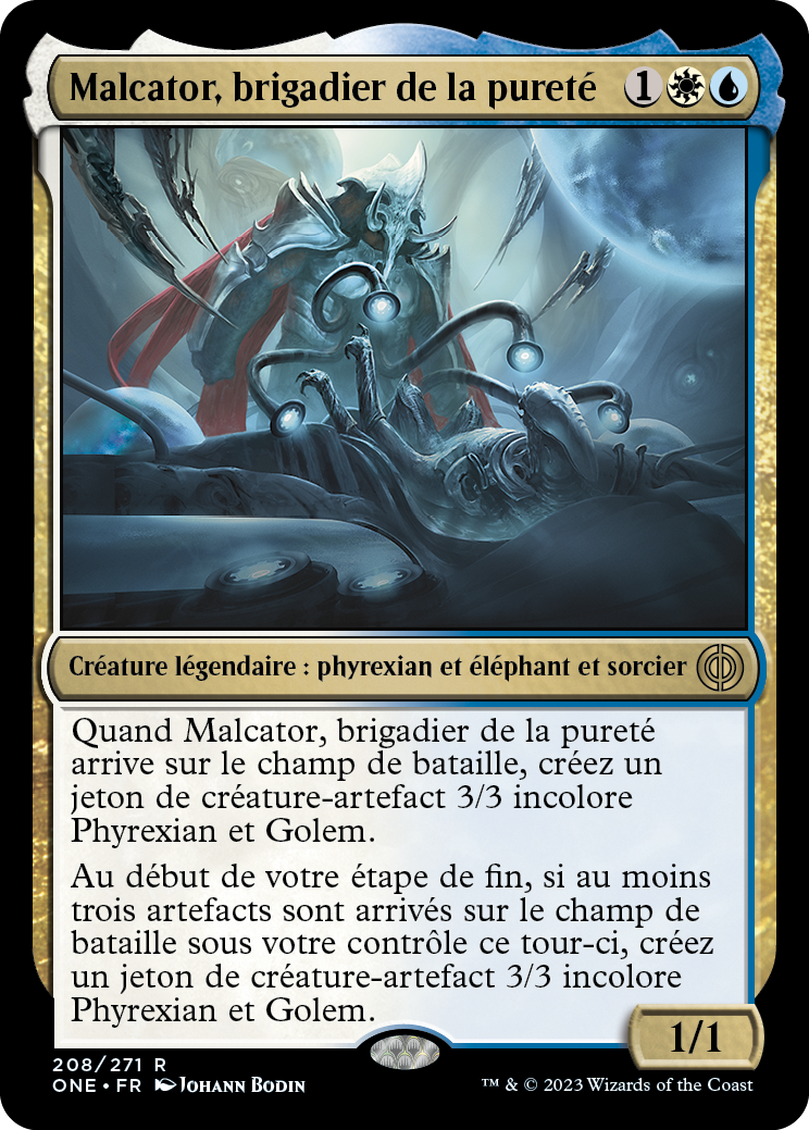 Quand Malcator, brigadier de la pureté arrive sur le champ de bataille, créez un jeton de créature-artefact 3/3 incolore Phyrexian et Golem.