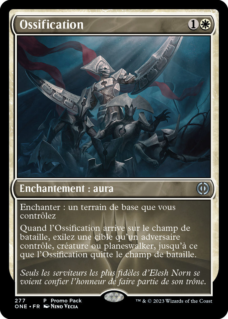 Quand l'Ossification arrive sur le champ de bataille, exilez une cible qu'un adversaire contrôle ,créature ou planeswalker, jusqu'à ce que l'Ossification quitte le champ de bataille.