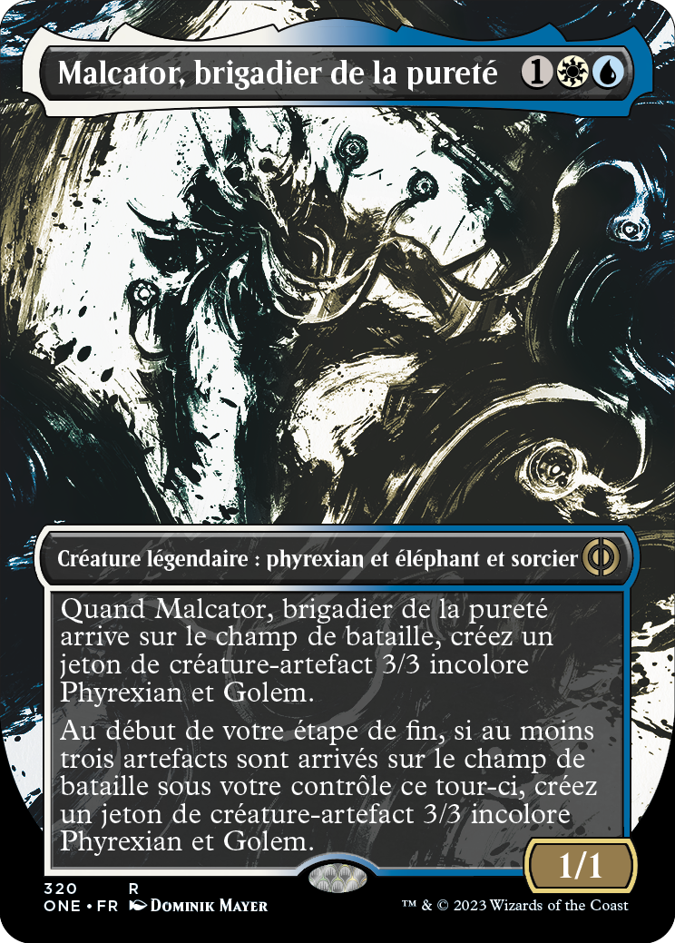 Quand Malcator, brigadier de la pureté arrive sur le champ de bataille, créez un jeton de créature-artefact 3/3 incolore Phyrexian et Golem.