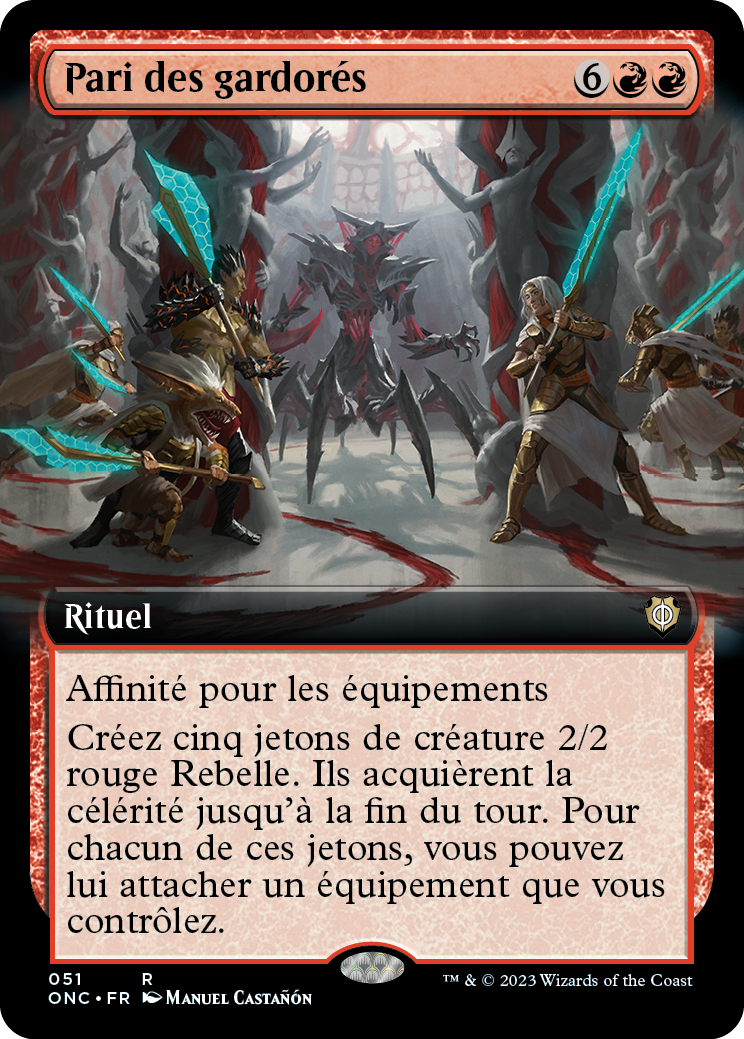 Créez cinq jetons de créature 2/2 rouge Rebelle. Ils acquièrent la célérité jusqu'à la fin du tour. Pour chacun de ces jetons, vous pouvez lui attacher un équipement que vous contrôlez.