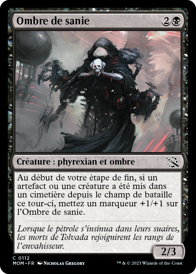 Au début de votre étape de fin, si un artefact ou une créature a été mis dans un cimetière depuis le champ de bataille ce tour-ci, mettez un marqueur +1/+1 sur l'Ombre de sanie.