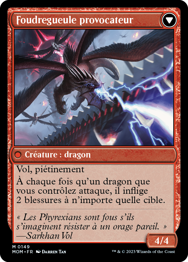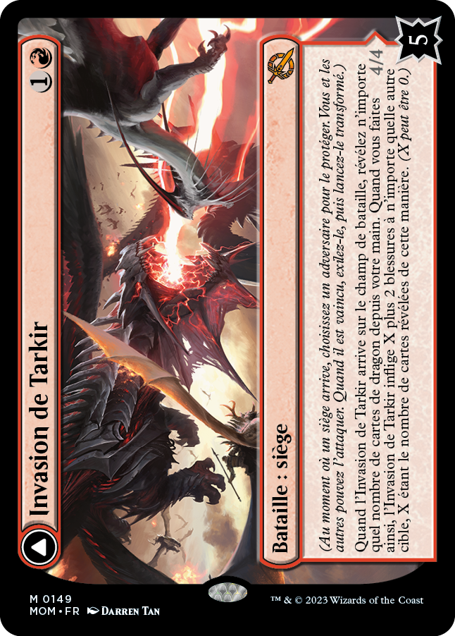 Quand l'Invasion de Tarkir arrive sur le champ de bataille, révélez n'importe quel nombre de cartes de dragon depuis votre main. Quand vous faites ainsi, l'Invasion de Tarkir inflige X plus 2 blessures à n'importe quelle autre cible, X étant le nombre de cartes révélées de cette manière. (X peut être