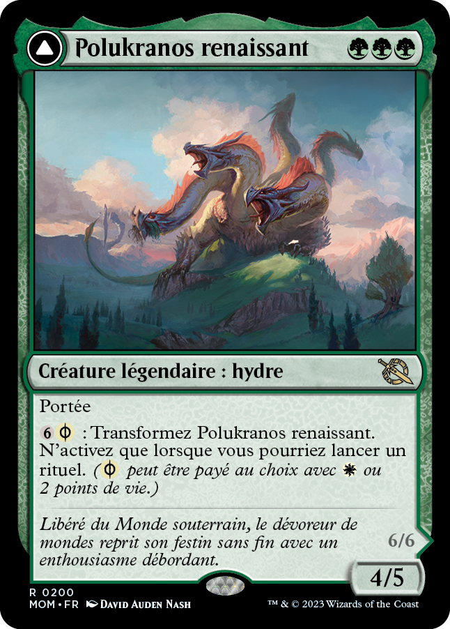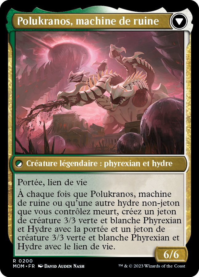 À chaque fois que Polukranos, machine de ruine ou qu'une autre hydre non-jeton que vous contrôlez meurt, créez un jeton de créature 3/3 verte et blanche Phyrexian et Hydre avec la portée et un jeton de créature 3/3 verte et blanche Phyrexian et Hydre avec le lien de vie.