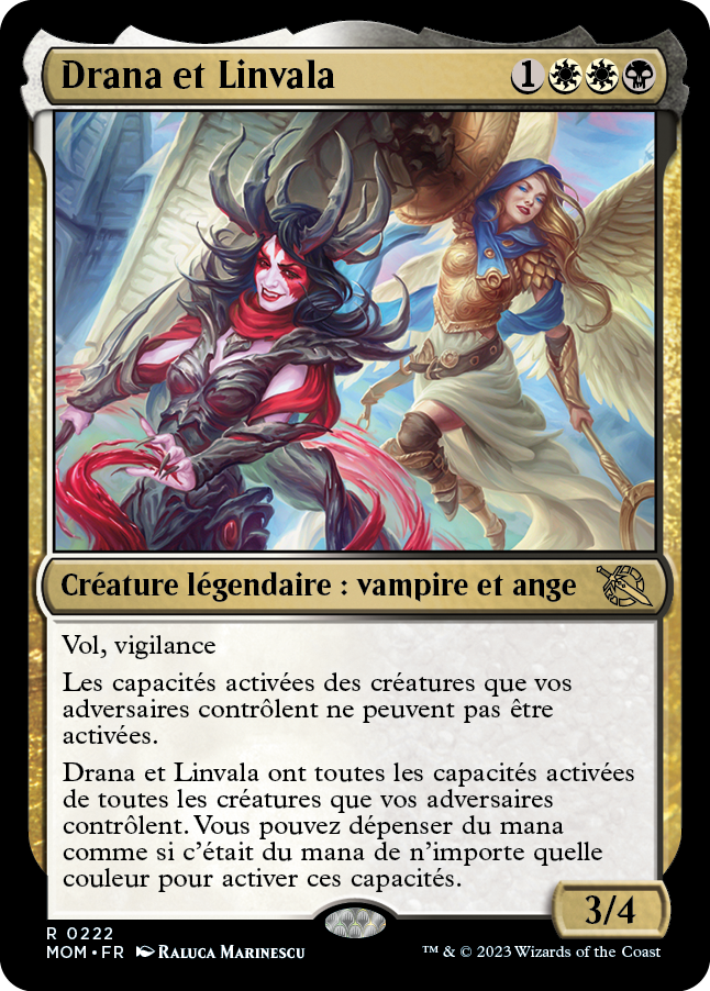 Drana et Linvala ont toutes les capacités activées de toutes les créatures que vos adversaires contrôlent. Vous pouvez dépenser du mana comme si c'était du mana de n'importe quelle couleur pour activer ces capacités.
