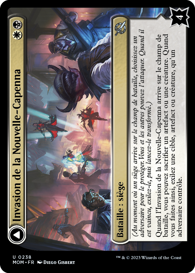 Quand l'Invasion de la Nouvelle-Capenna arrive sur le champ de bataille, vous pouvez sacrifier un artefact ou une créature. Quand vous faites ainsi, exilez une cible, artefact ou créature, qu'un adversaire contrôle.