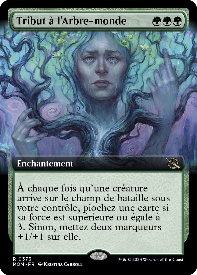 À chaque fois qu'une créature arrive sur le champ de bataille sous votre contrôle, piochez une carte si sa force est supérieure ou égale à . Sinon, mettez deux marqueurs +1/+1 sur elle.
