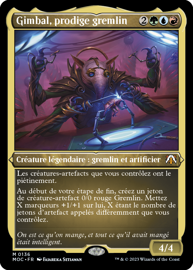 Au début de votre étape de fin, créez un jeton de créature-artefact 0/0 rouge Gremlin. Mettez X marqueurs +1/+1 sur lui, X étant le nombre jetons d'artefact appelés différemment que vous contrôlez.