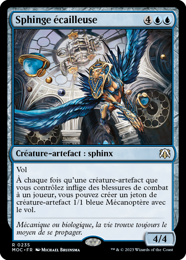 À chaque fois qu'une créature-artefact que vous contrôlez inflige des blessures de combat à un joueur, vous pouvez créer un jeton de créature-artefact 1/1 bleue Mécanoptère avec le vol.