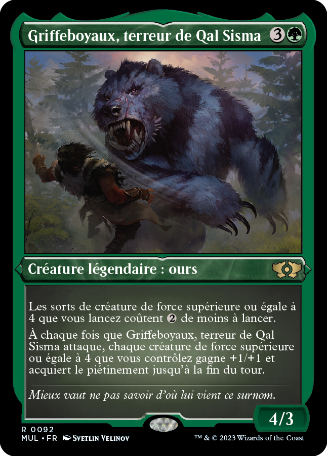 À chaque fois que Griffeboyaux, terreur de Qal Sisma attaque, chaque créature de force supérieure ou égale à 4 que vous contrôlez gagne +1/+1 et acquiert le piétinement jusqu'à la fin du tour.