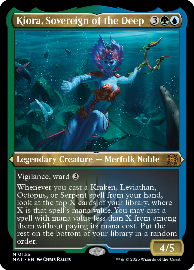À chaque fois que vous lancez un sort de kraken, de leviathan, de pieuvre ou de grand serpent depuis votre main, regardez les X cartes du dessus de votre bibliothèque, X étant la valeur de mana de ce sort. Vous pouvez lancer un sort avec une valeur de mana inférieure ou égale à X parmi elles sans payer son coût de mana. Mettez le reste au-dessous de votre bibliothèque dans un ordre aléatoire.