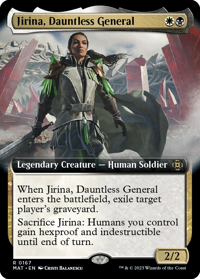 Sacrifiez Jirina : Les humains que vous contrôlez acquièrent la défense talismanique et l'indestructible jusqu'à la fin du tour.