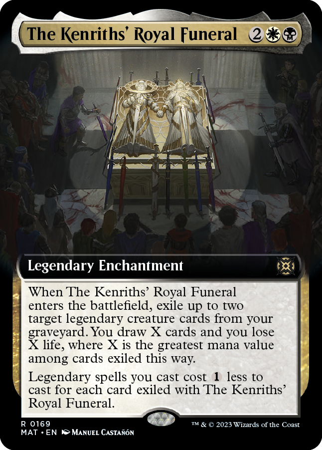 Quand The Kenriths' Royal Funeral arrive sur le champ de bataille, exilez jusqu'à deux cartes de créature légendaire ciblées depuis votre cimetière. Vous piochez X cartes et vous perdez X points de vie, X étant la valeur de mana la plus élevée parmi les cartes exilées de cette manière.
