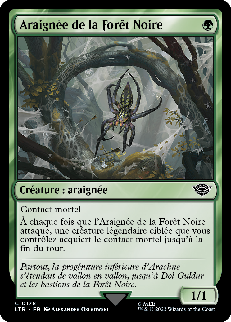 À chaque fois que l'Araignée de la Forêt Noire attaque, une créature légendaire ciblée que vous contrôlez acquiert le contact mortel jusqu'à la fin du tour.