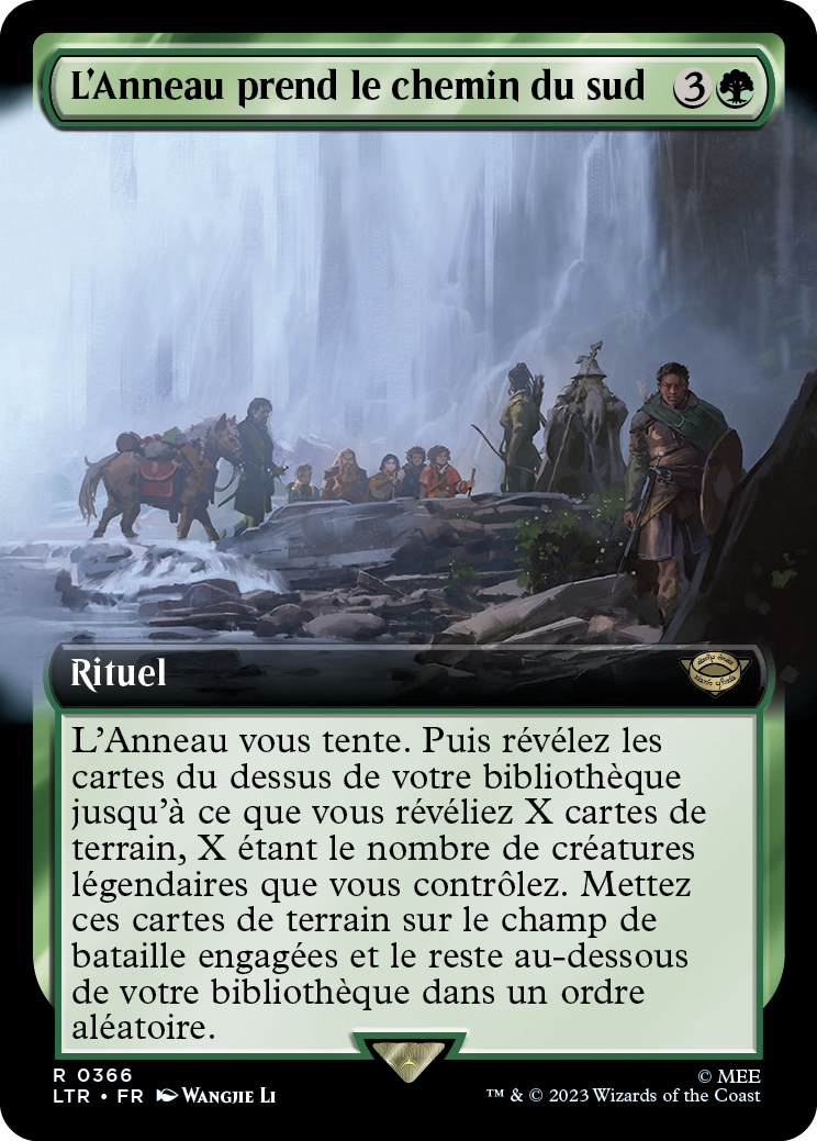 L'Anneau vous tente. Puis révélez les cartes du dessus de votre bibliothèque jusqu'à ce que vous révéliez X cartes de terrain, X étant le nombre de créatures légendaires que vous contrôlez. Mettez ces carte de terrain sur le champ de bataille engagées et le reste au-dessous votre bibliothèque dans un ordre aléatoire.