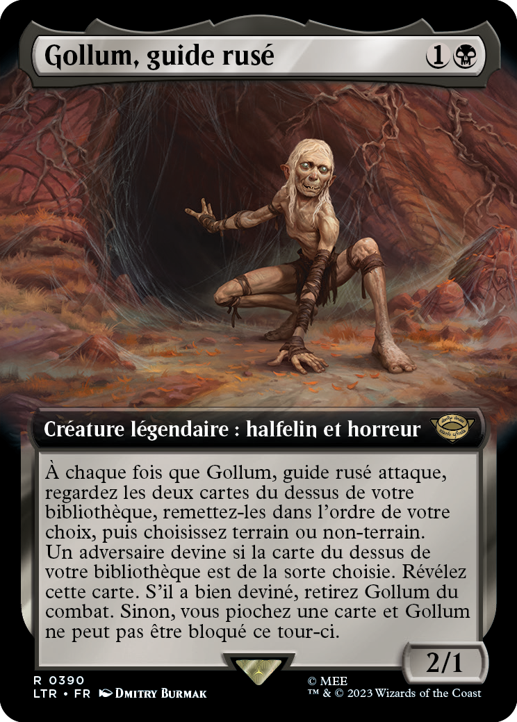 À chaque fois que Gollum, guide rusé attaque, regardez les deux cartes du dessus de votre bibliothèque, remettez-les dans l'ordre de votre choix, puis choisissez terrain ou non-terrain. Un adversaire devine si la carte du dessus de votre bibliothèque est de la sorte choisie. Révélez cette carte. Si l'ont deviné correctement, retirez Gollum du combat. Sinon, vous piochez une carte et Gollum ne peut pas être bloqué ce tour-ci.