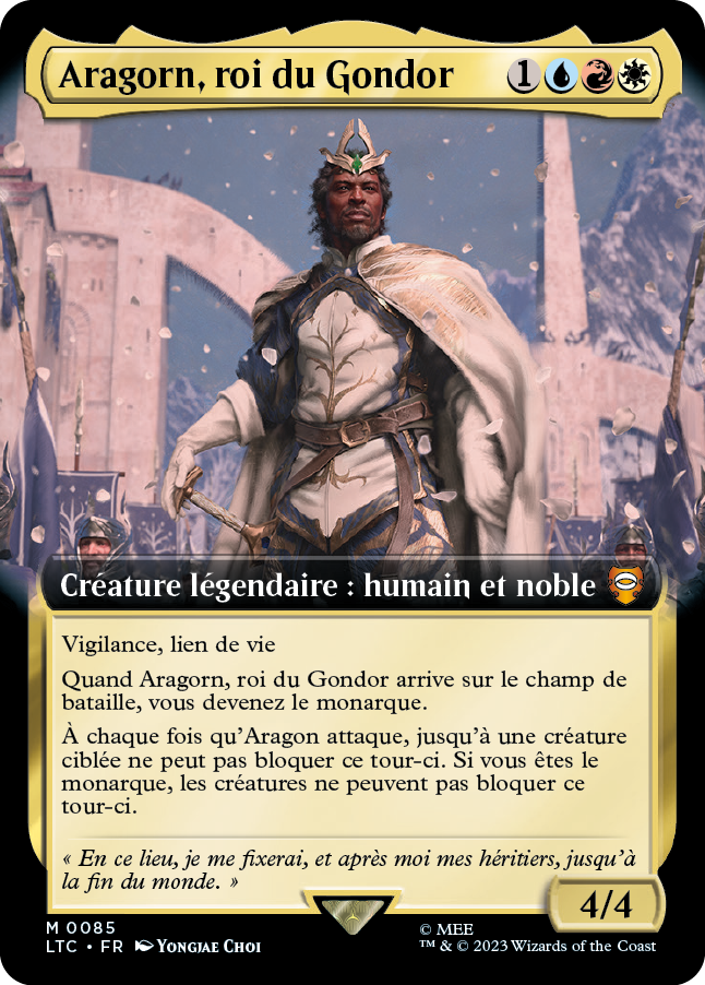 À chaque fois qu'Aragorn attaque, jusqu'à une créature ciblée ne peut pas bloquer ce tour-ci. Si vous êtes le monarque, les créatures ne peuvent pas bloquer ce tour-ci.