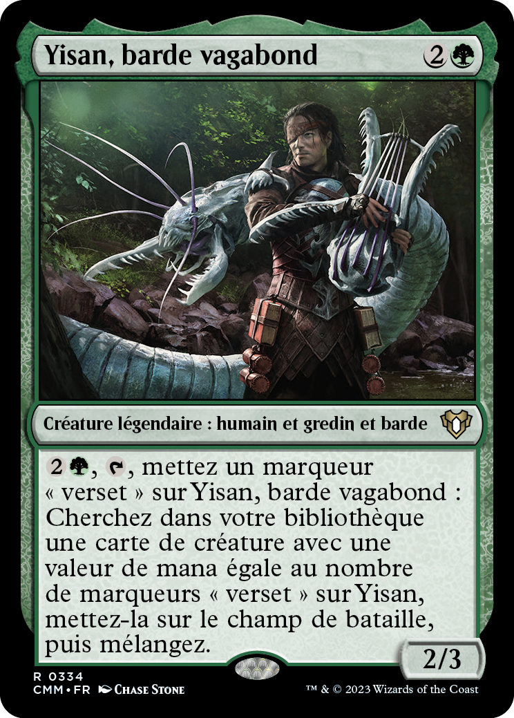 , mettez un marqueur "verset" sur Yisan, barde vagabond : Cherchez dans votre bibliothèque une carte créature avec une valeur de mana égale au nombre de marqueurs "verset" sur Yisan, mettez-la sur le champ de bataille, puis mélangez.Vous n'êtes pas connecté ! connectez-vous ou inscrivez-vous pour poster un commentaire