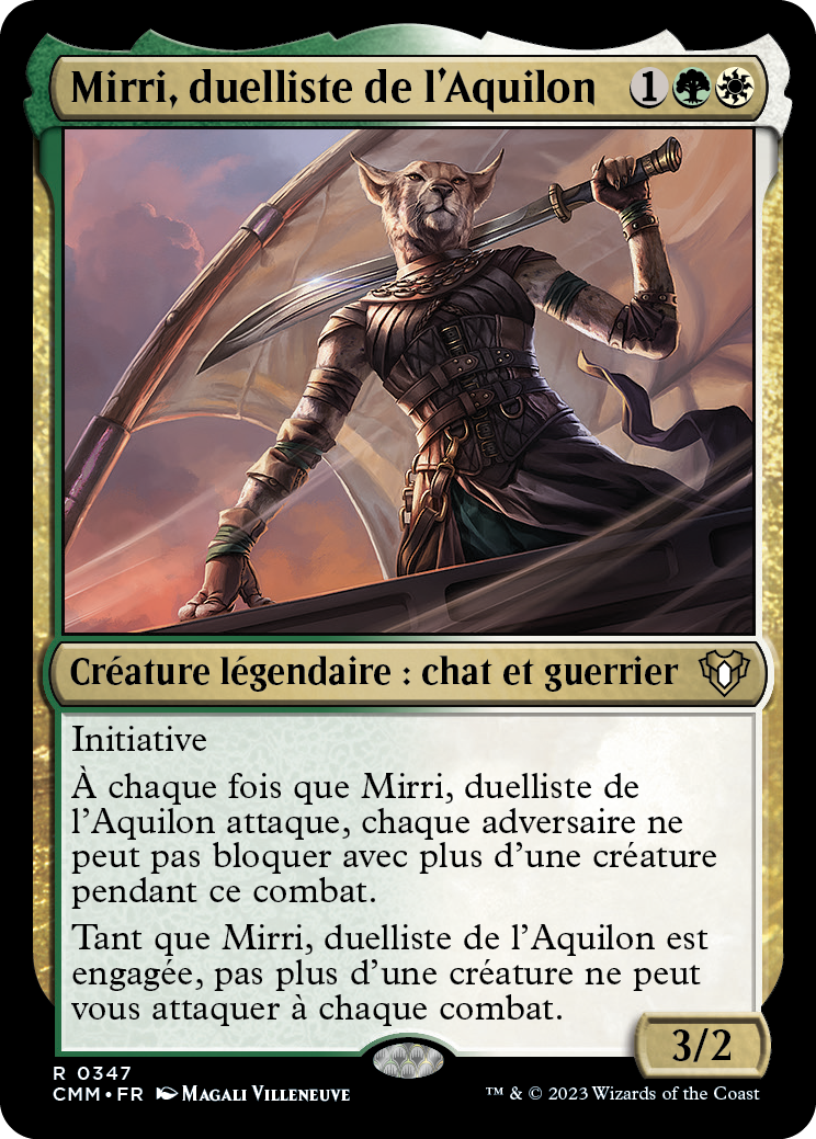 À chaque fois que Mirri, duelliste de l'Aquilon attaque, chaque adversaire ne peut pas bloquer avec plus d'une créature pendant ce combat.