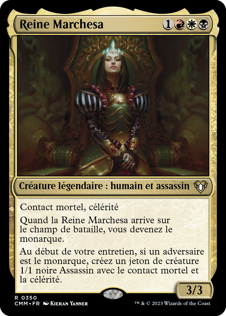 Au début de votre entretien, si un adversaire est le monarque, créez un jeton de créature 1/1 noire Assassin avec le contact mortel et la célérité.