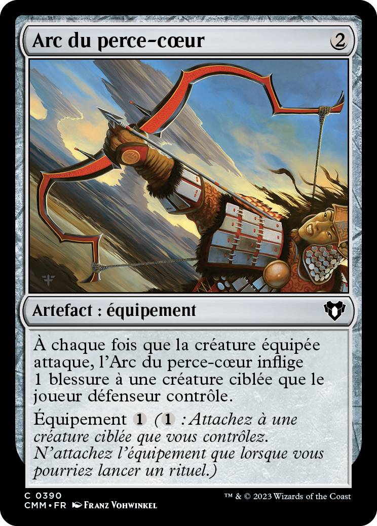 À chaque fois que la créature équipée attaque, l'Arc du perce-cœur inflige 1 blessure à une créature ciblée que le joueur défenseur contrôle.