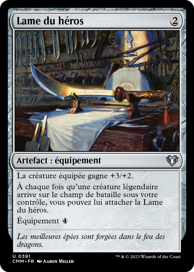 À chaque fois qu'une créature légendaire arrive sur le champ de bataille sous votre contrôle, vous pouvez lui attacher la Lame du héros.