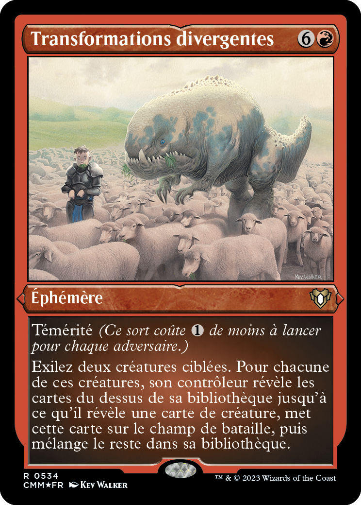 Exilez deux créatures ciblées. Pour chacune de ces créatures, son contrôleur révèle les cartes du dessus de sa bibliothèque jusqu'à ce qu'il révèle une carte de créature, met cette carte sur le champ de bataille, puis mélange le reste dans sa bibliothèque.
