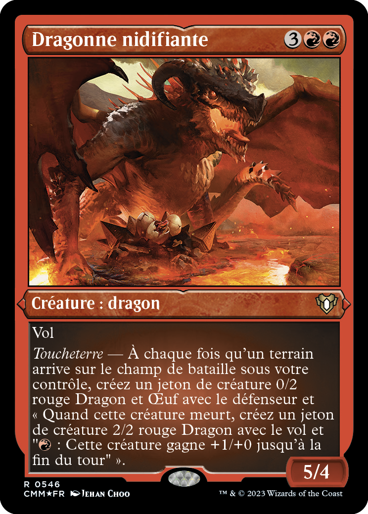 Toucheterre — À chaque fois qu'un terrain arrive sur le champ de bataille sous votre contrôle, créez un jeton de créature 0/2 rouge Dragon et Œuf avec le défenseur et "Quand cette créature meurt, créez un jeton de créature 2/2 rouge Dragon avec le vol et '