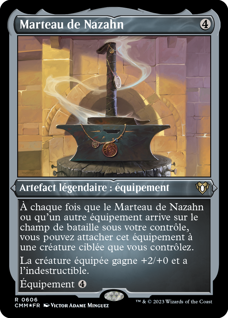 À chaque fois que le Marteau de Nazahn ou qu'un autre équipement arrive sur le champ de bataille sous votre contrôle, vous pouvez attacher cet équipement à une créature ciblée que vous contrôlez.