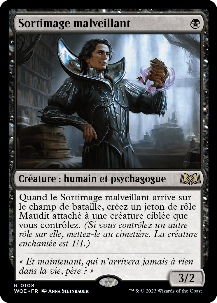Quand le Sortimage malveillant arrive sur le champ de bataille, créez un jeton de rôle Maudit attaché à une créature ciblée que vous contrôlez. (Si vous contrôlez un autre rôle sur elle, mettez-le au cimetière. La créature enchantée est 1/1.).