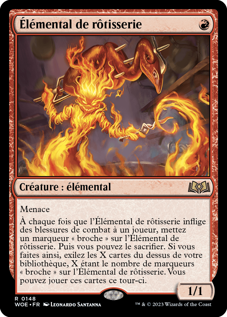 À chaque fois que Rotisserie Elemental inflige des blessures de combat à un joueur, mettez un marqueur "brochette" sur Rotisserie Elemental. Puis vous pouvez le sacrifier. Si vous faites ainsi, exilez les X cartes du dessus de votre bibliothèque, X étant le nombre de marqueurs "brochette" sur Rotisserie Elemental. Vous pouvez jouer ces cartes ce tour-ci.