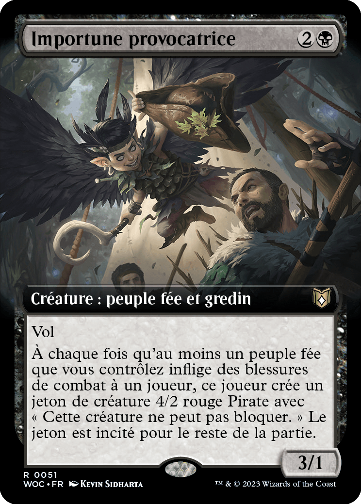 À chaque fois qu'au moins un peuple fée que vous contrôlez inflige des blessures de combat à un joueur, ce joueur crée un jeton de créature 4/2 rouge Pirate avec "Cette créature ne peut pas bloquer." Ce jeton est incité pour le reste de la partie.