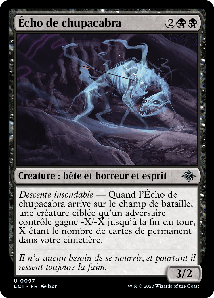 Descente insondable — Quand l'Écho de chupacabra arrive sur le champ de bataille, une créature ciblée qu'un adversaire contrôle gagne -X/-X jusqu'à la fin du tour, X étant le nombre de cartes de permanent dans votre cimetière.