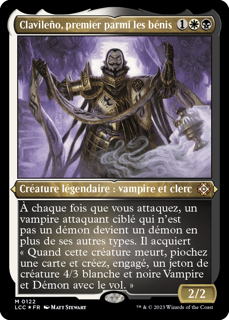 À chaque fois que vous attaquez, un vampire attaquant ciblé qui n'est pas un démon devient un démon en plus de ses autres types. Il acquiert "Quand cette créature meurt, piochez une carte et créez, engagé, un jeton de créature 4/3 blanche et noire Vampire et Démon avec le vol.".
