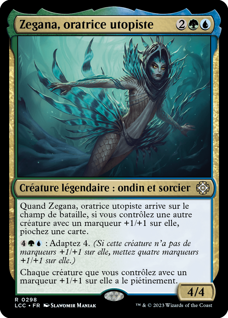 Quand Zegana, oratrice utopiste arrive sur le champ de bataille, si vous contrôlez une autre créature avec un marqueur +1/+1 sur elle, piochez une carte.